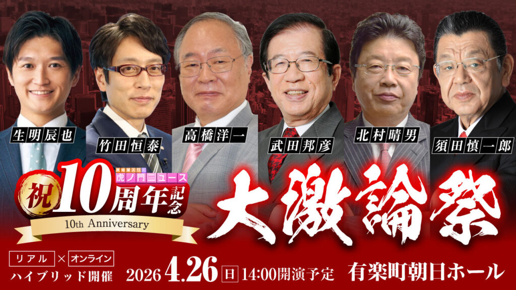 お知らせ 【お知らせ】真相深入り! 虎ノ門ニュース 10周年記念 [リアル×オンライン] イベントを開催! 2026年02月16日2026年02月13日 昨2025年、虎ノ門ニュースは番組開始から10周年を迎えました。そこで、豪華言論人が一同に会したスペシャルイベントを開催します! イベントの詳細はこちらから!